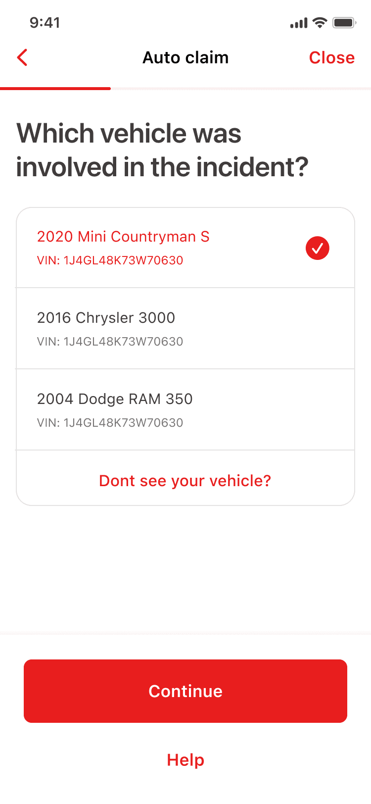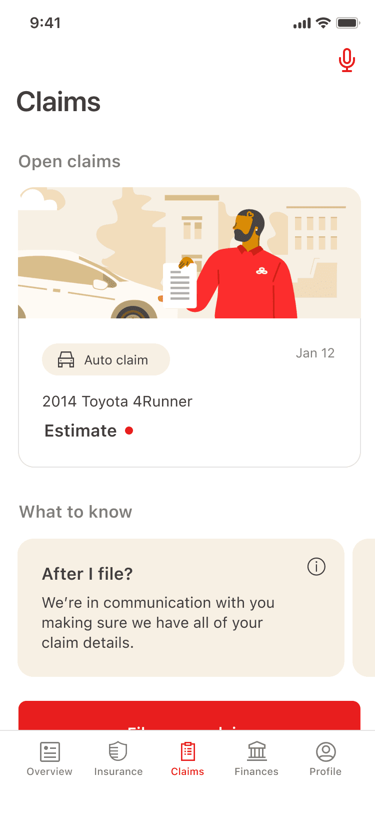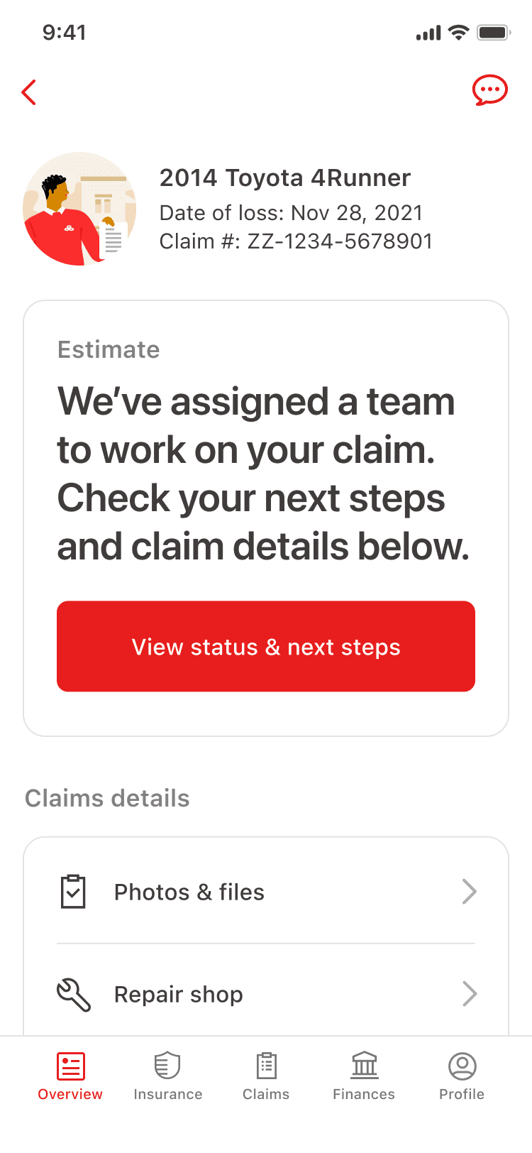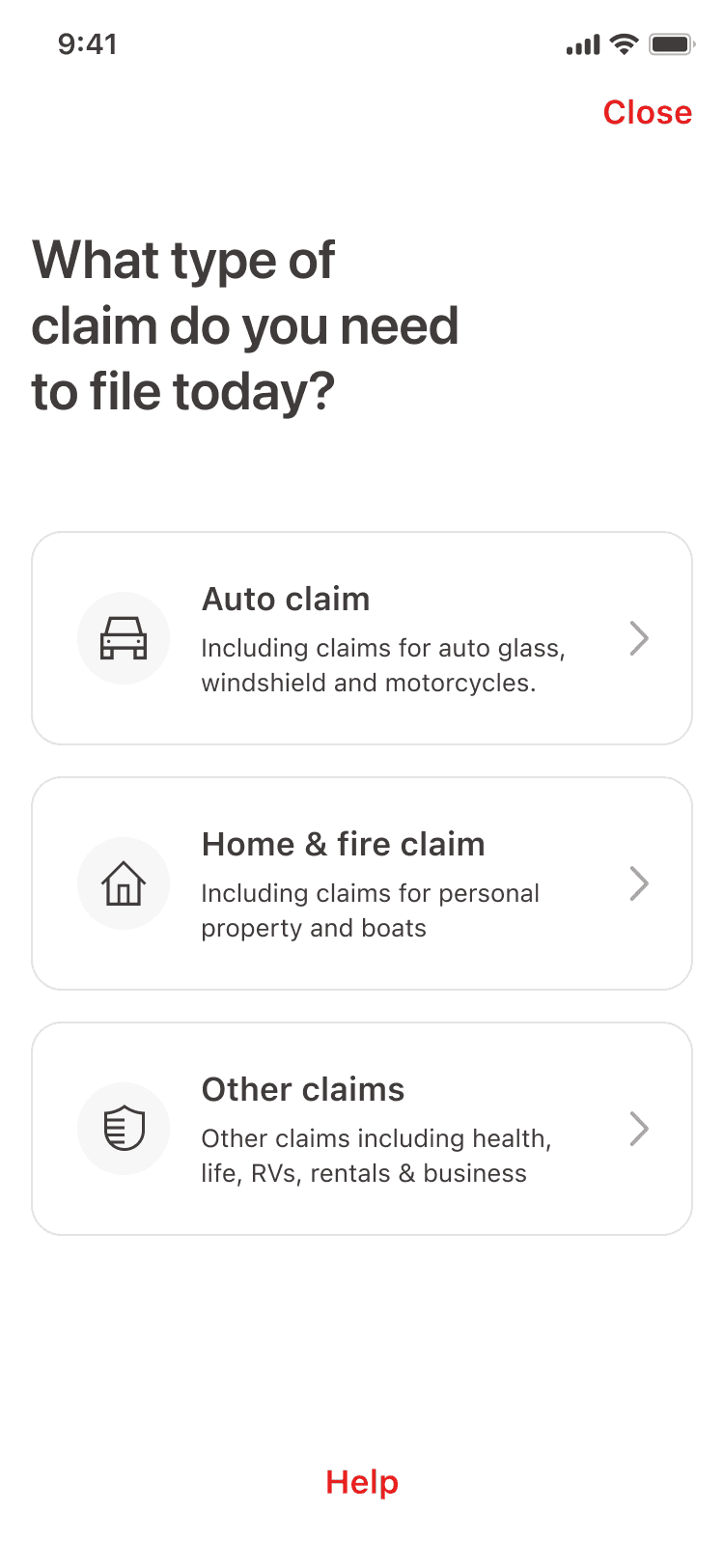 Less "taps" does not mean a better experience. We intentionally give clarity over speed during a claim filing process. Focused, step-by-step guidance to assure users give accurate and complete details.
